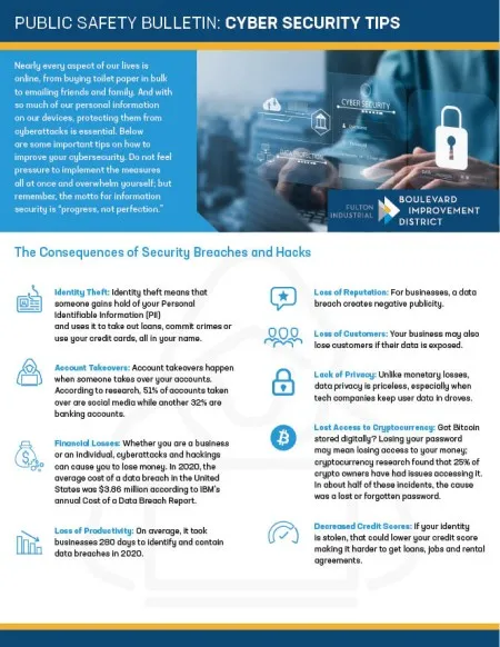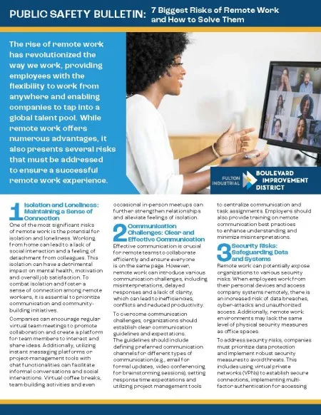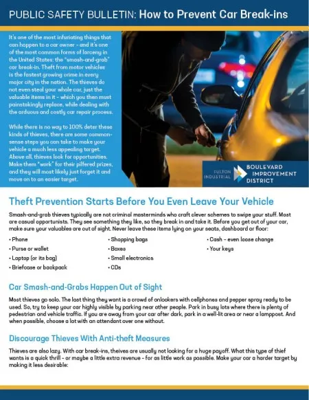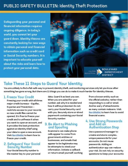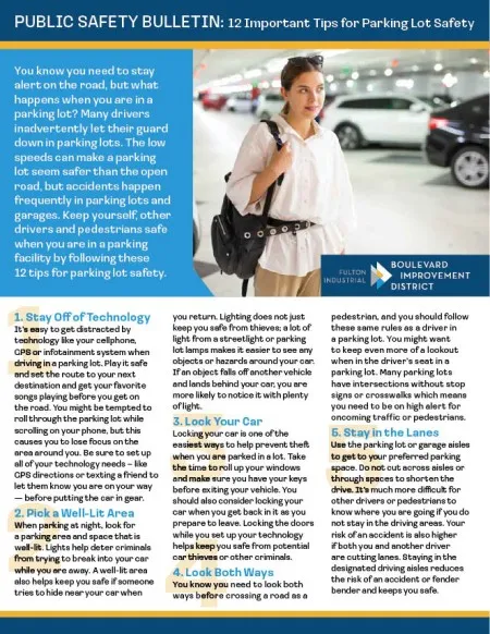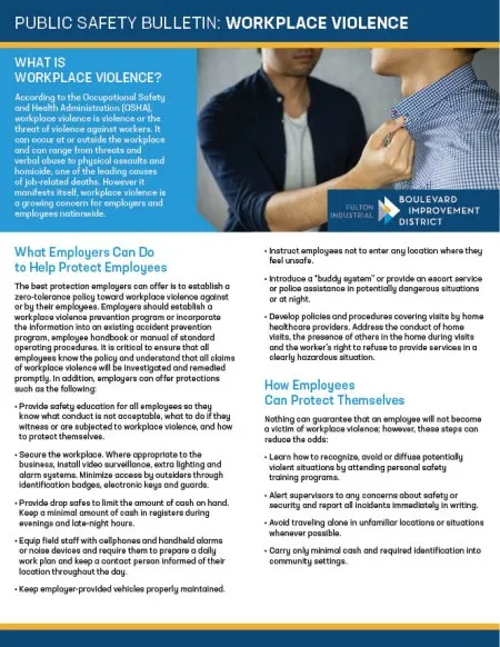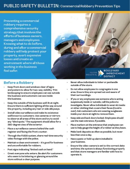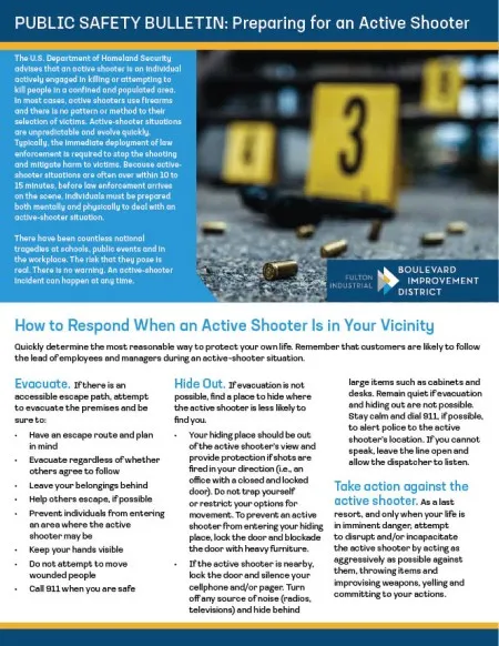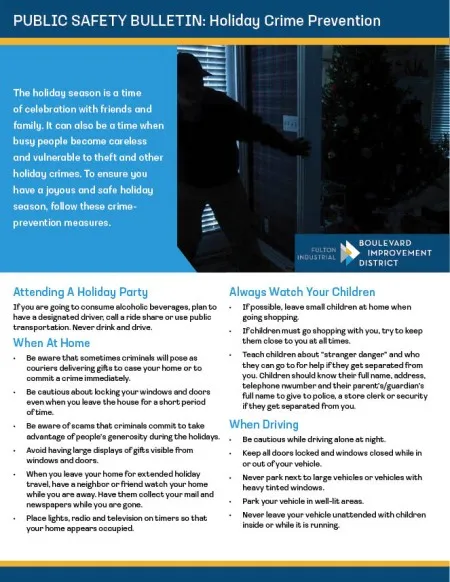As part of the public safety program, the CID regularly produces public safety bulletins for use by businesses in the Fulton Industrial area. These bulletins can be shared with employees and have helpful safety tips and reminders. The bulletins are offered at no charge and may be downloaded from the library below.